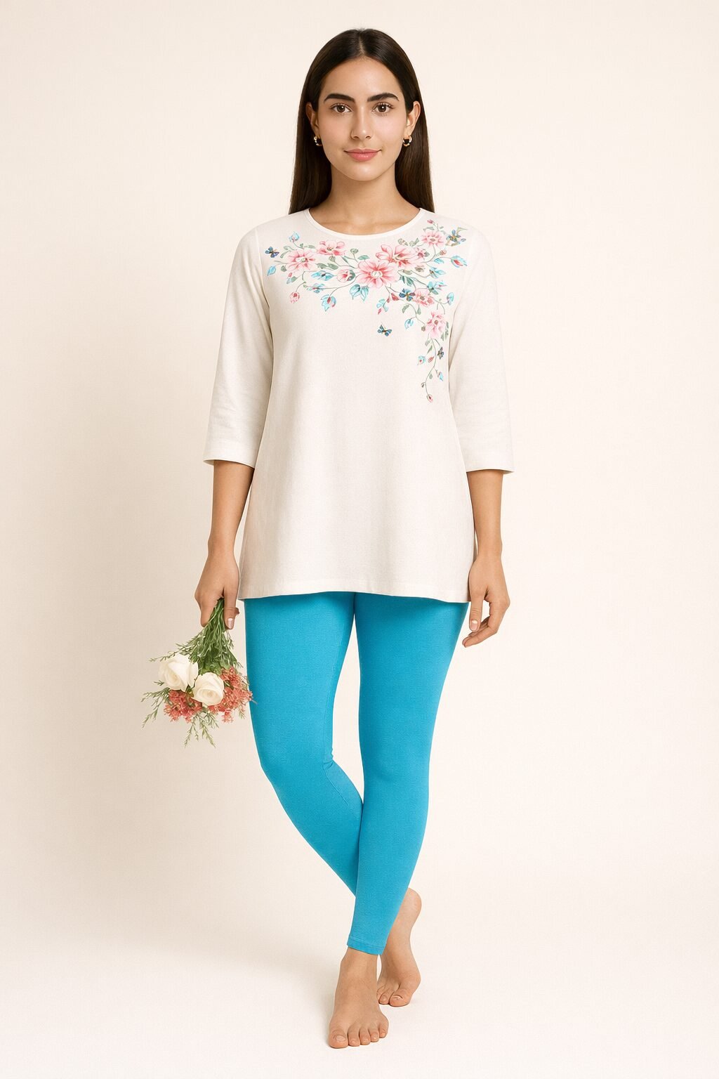 The aqua blue Ankle colour shade pairs beautifully with whites, blacks, beige, floral tops, and ethnic tops . Designed to move with you, these leggings stay in shape even after multiple washes. Whether you’re dressing up for a casual outing or styling for traditional events, these leggings bring confidence and charm to your look.
