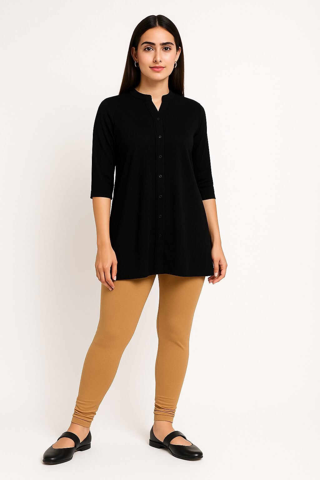 The breathable fabric feels soft on the skin, while the elastic waistband ensures a secure and flexible fit. These leggings are perfect for pairing with kurtis, tops, or tunics, making them suitable for both casual outings and daily wear.