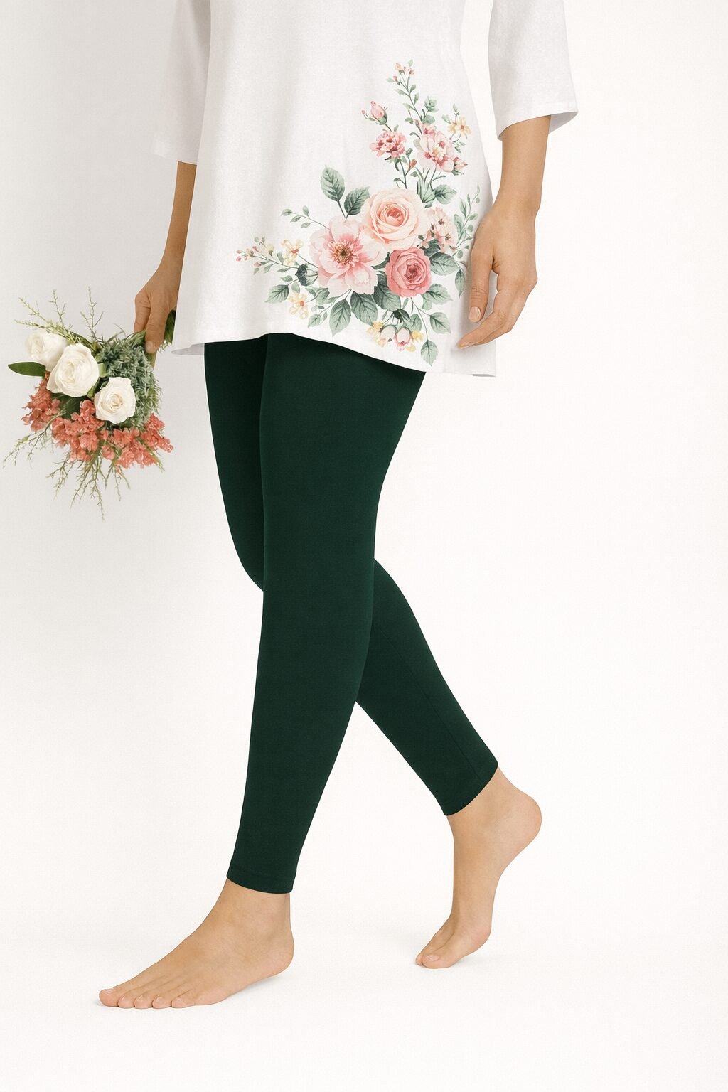 The Deep forest green Ankle  colour shade pairs beautifully with whites, blacks, beige, floral tops, and ethnic tops . Designed to move with you, these leggings stay in shape even after multiple washes. Whether you’re dressing up for a casual outing or styling for traditional events, these leggings bring confidence and charm to your look.