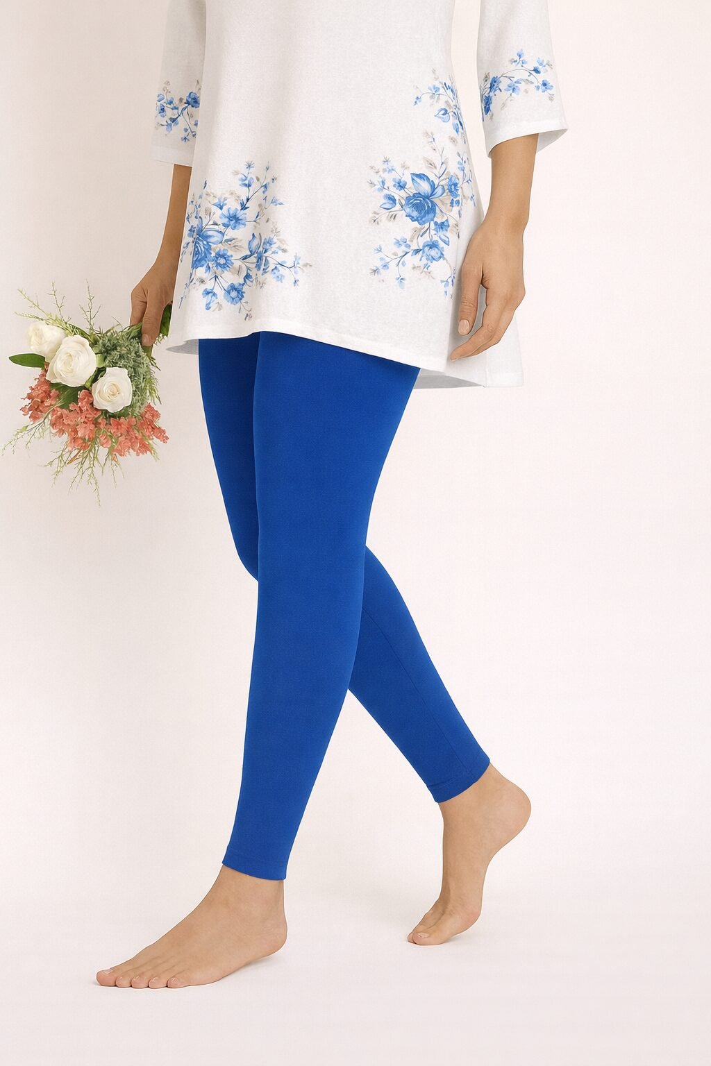 The French blue Ankle  colour shade pairs beautifully with whites, blacks, beige, floral tops, and ethnic tops . Designed to move with you, these leggings stay in shape even after multiple washes. Whether you’re dressing up for a casual outing or styling for traditional events, these leggings bring confidence and charm to your look.