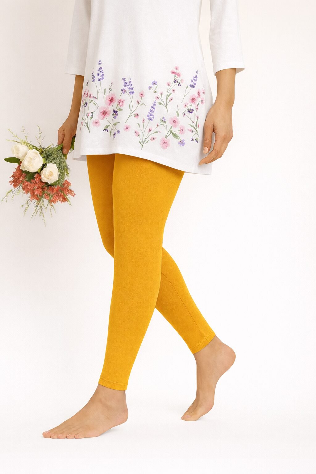 The golden yellow Ankle colour shade pairs beautifully with whites, blacks, beige, floral tops, and ethnic tops . Designed to move with you, these leggings stay in shape even after multiple washes. Whether you’re dressing up for a casual outing or styling for traditional events, these leggings bring confidence and charm to your look.