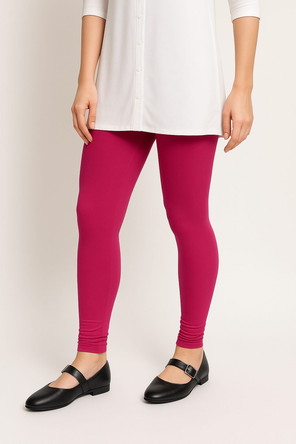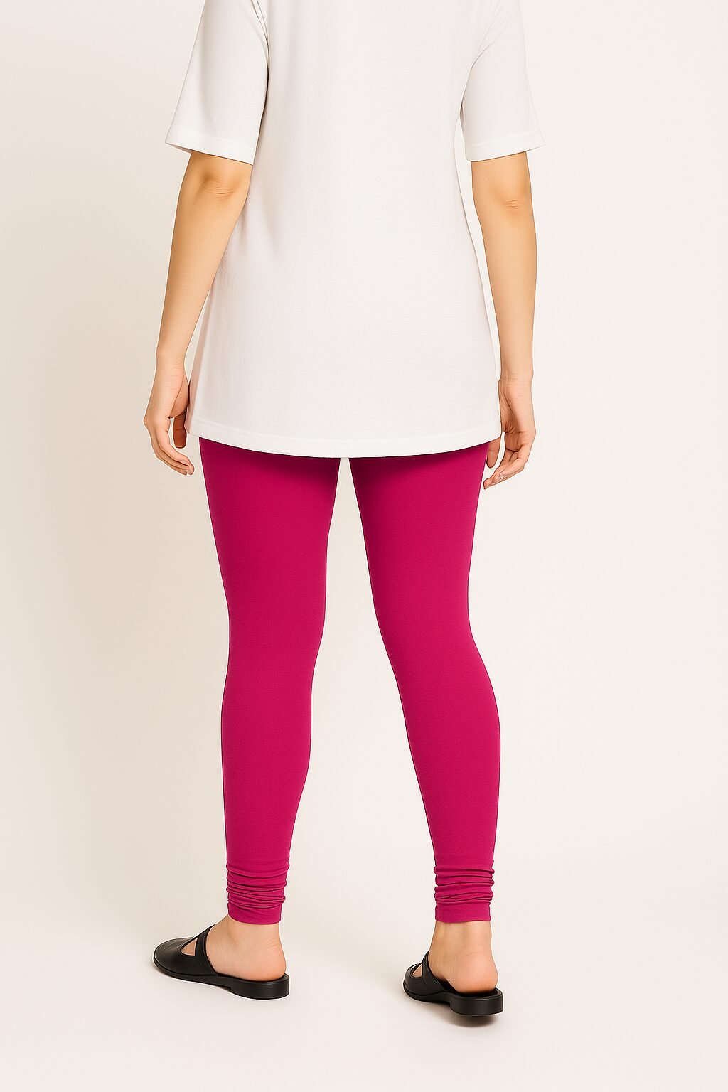 The hot pink colour shade pairs beautifully with whites, blacks, beige, floral tops, and ethnic tops . Designed to move with you, these leggings stay in shape even after multiple washes. Whether you’re dressing up for a casual outing or styling for traditional events, these leggings bring confidence and charm to your look.