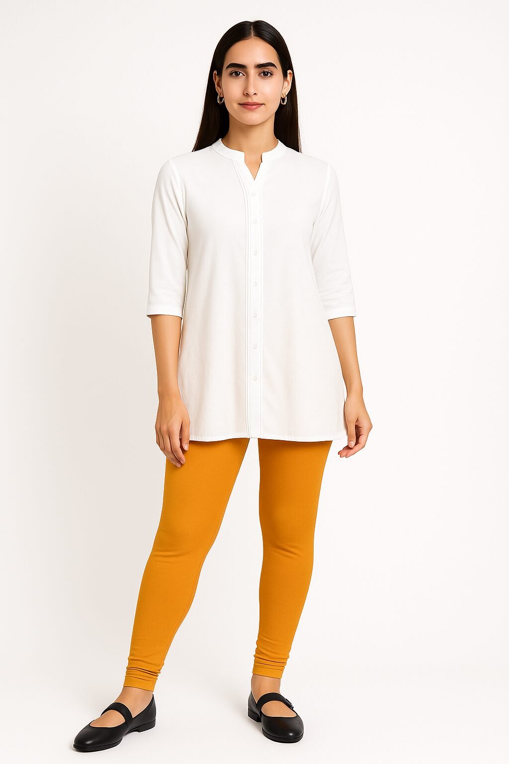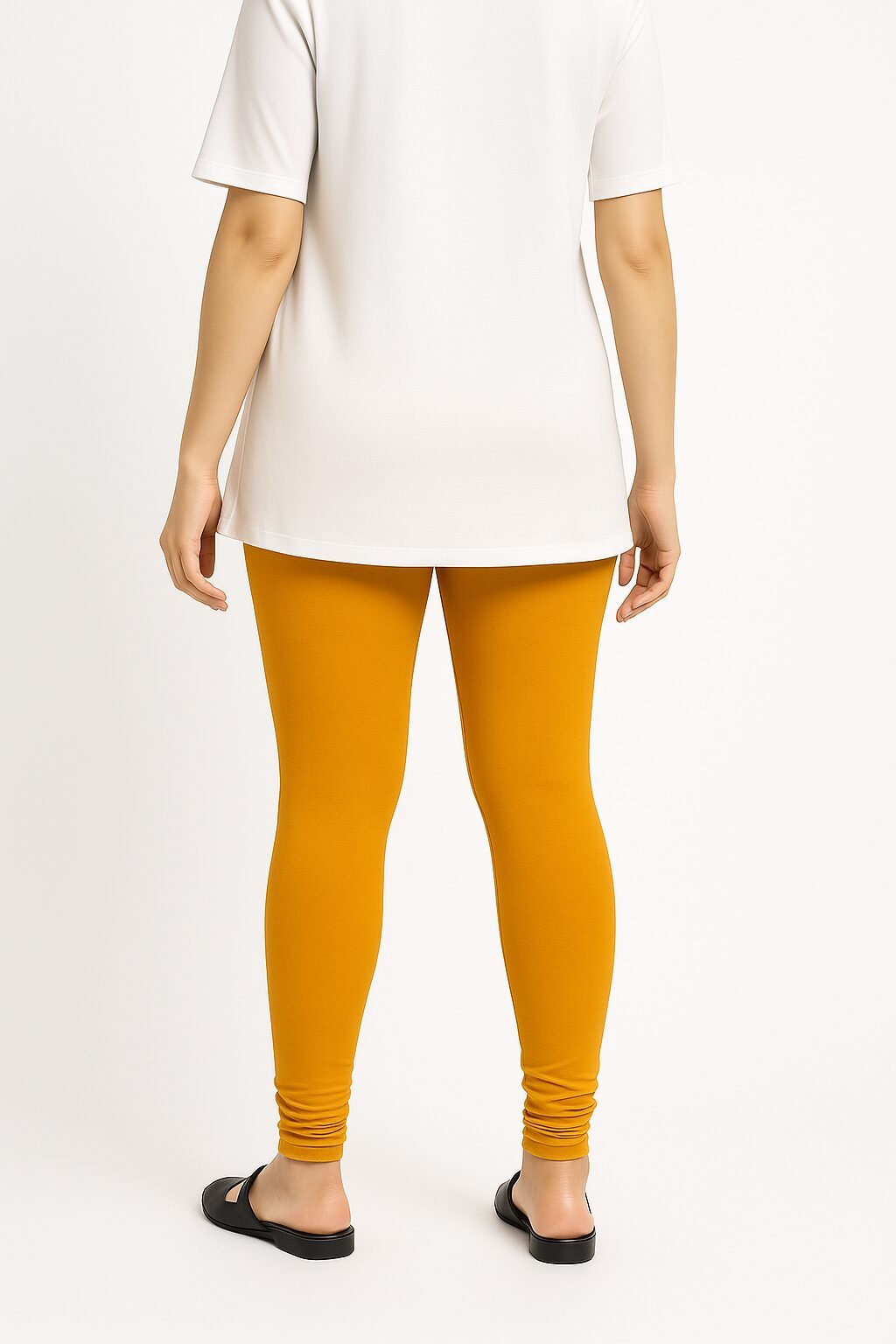 Mustard yellow ankle length leggings for women crafted with premium soft cotton fabric for all-day comfort. These stretchable and breathable leggings offer a slim fit, making them perfect for casual outings, office wear, or pairing with kurtis and tops. The elastic waistband ensures a secure and comfortable fit, making them a versatile wardrobe essential.