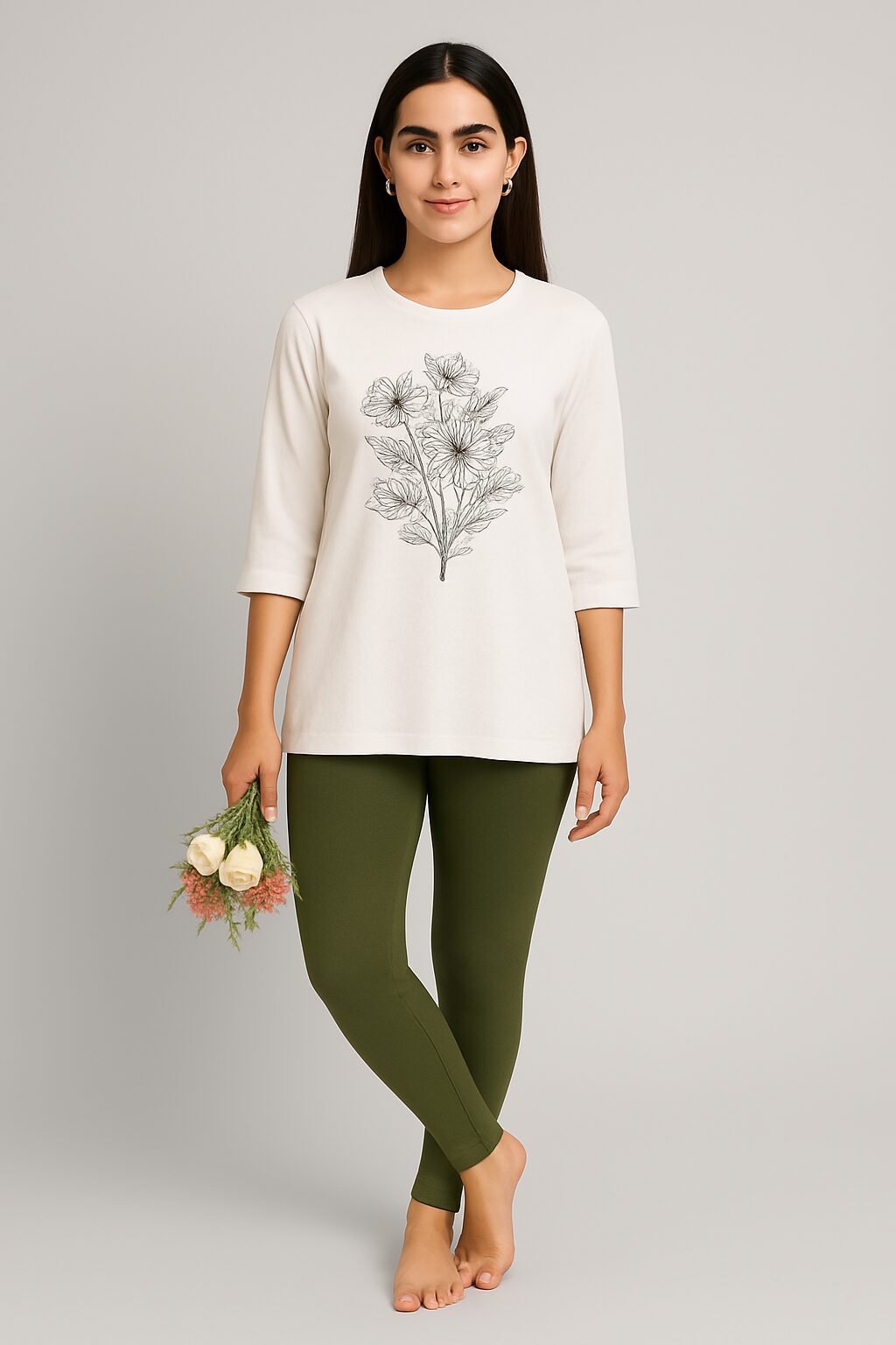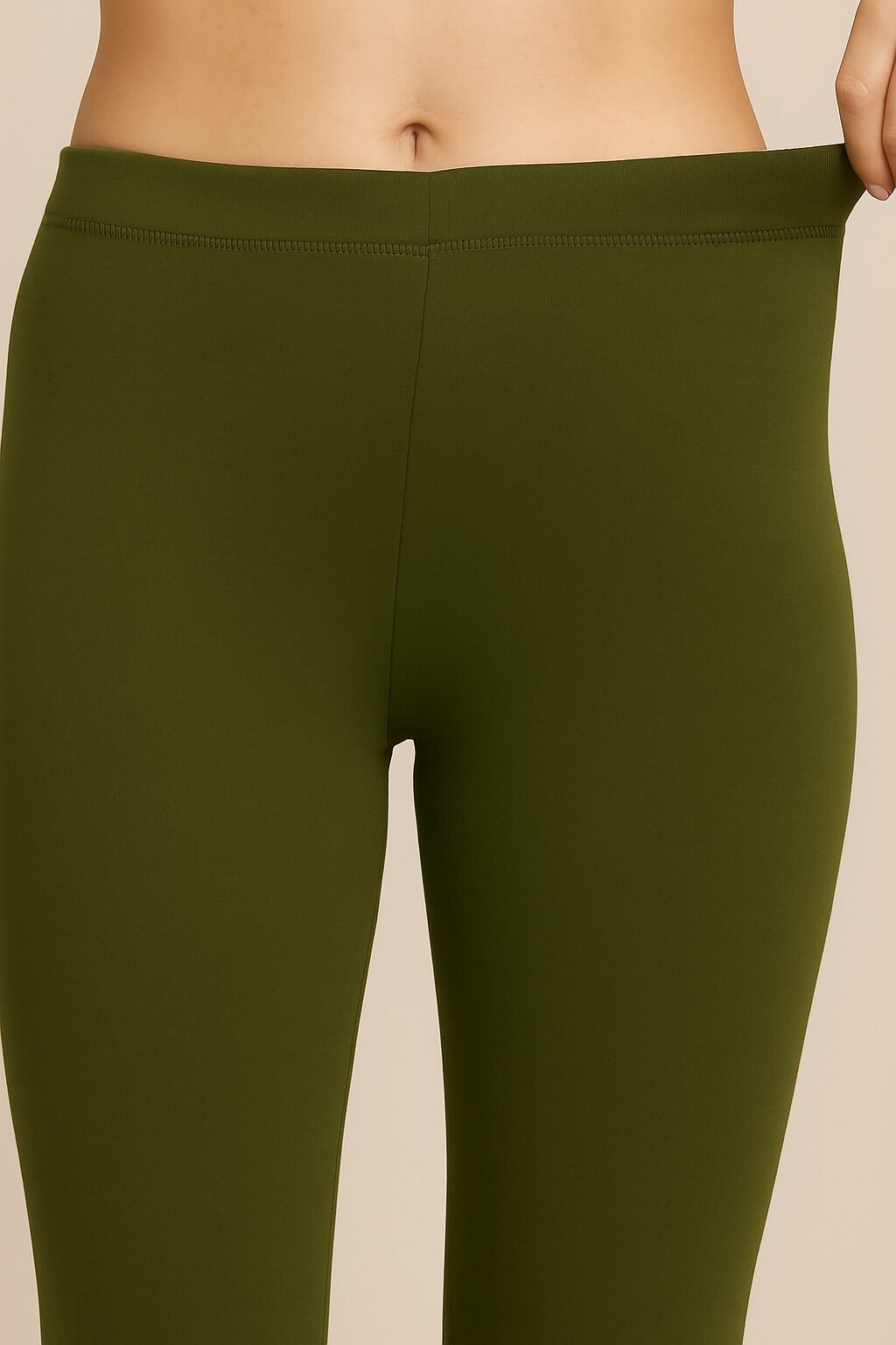 Olive green ankle length leggings for women crafted with premium soft cotton fabric for all-day comfort. Stretchable and breathable, these leggings provide a slim fit ideal for casual outings, office wear, or pairing with kurtis and tops. The elastic waistband ensures a secure and comfortable fit, making them a versatile wardrobe essential.