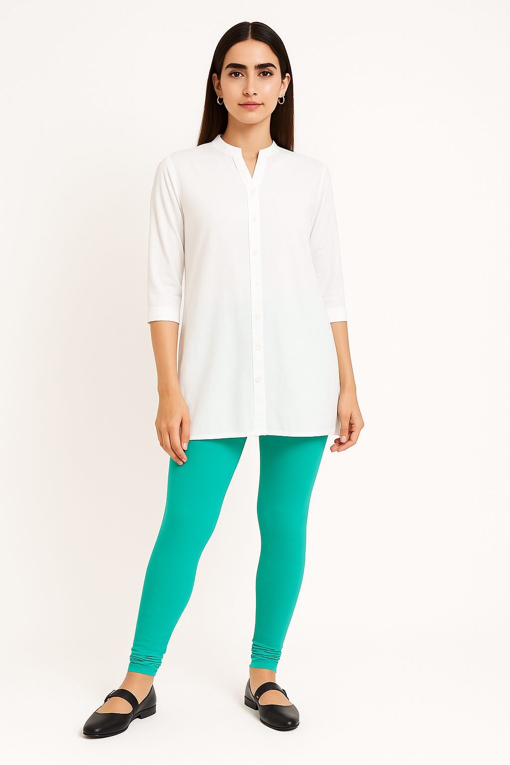The sea foam green colour shade pairs beautifully with whites, blacks, beige, floral tops, and ethnic tops . Designed to move with you, these leggings stay in shape even after multiple washes. Whether you’re dressing up for a casual outing or styling for traditional events, these leggings bring confidence and charm to your look.
