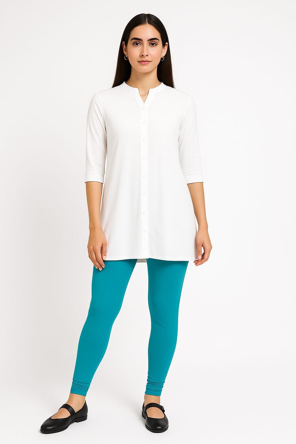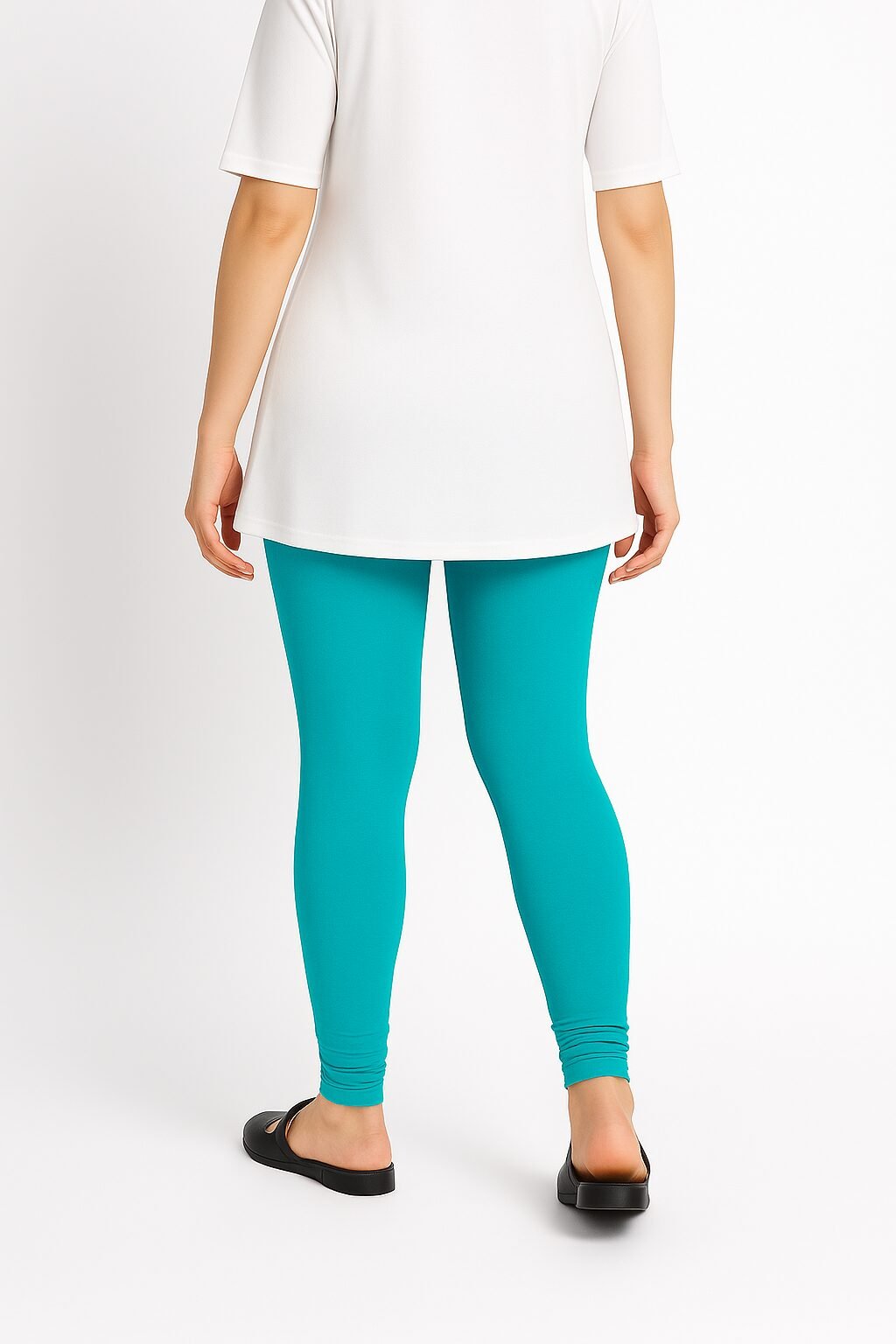The turquoise blue colour shade pairs beautifully with whites, blacks, beige, floral tops, and ethnic tops . Designed to move with you, these leggings stay in shape even after multiple washes. Whether you’re dressing up for a casual outing or styling for traditional events, these leggings bring confidence and charm to your look.